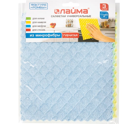 Салфетки LAIMA универсальные, КОМПЛЕКТ 3шт, микрофибра губчатая, 3 слоя, 17х20см, ромбы, 606657