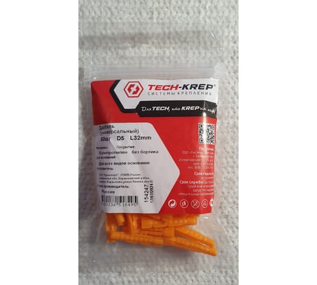 Универсальный дюбель Tech-Krep/Zitar 5x32 мм, без бортика, 50 шт., пакет 154247 На страницу товара55 ₽