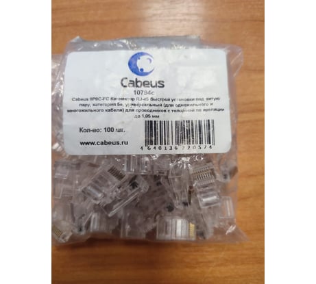 Универсальный коннектор RJ-45 Cabeus быстрой установки под витую пару, категория 5e, (для одножильного и многожильного кабеля) 100 шт 8P8C-FC используется для оконцевания неэкранированного кабеля витой пары категории 5е. Имеет универсальные ножи, подходящие для одножильного и многожильного кабеля.