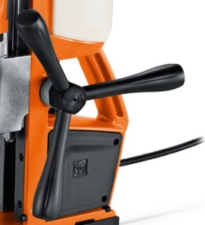 Электромагнит с увеличенной прижимной силой осуществляет надежное крепления станка к поверхности. В сверлильной стойке станка расположен дополнительный выключатель магнита. Встроенная система подачи СОЖ охлаждает сверло, не давая ему перегреваться.