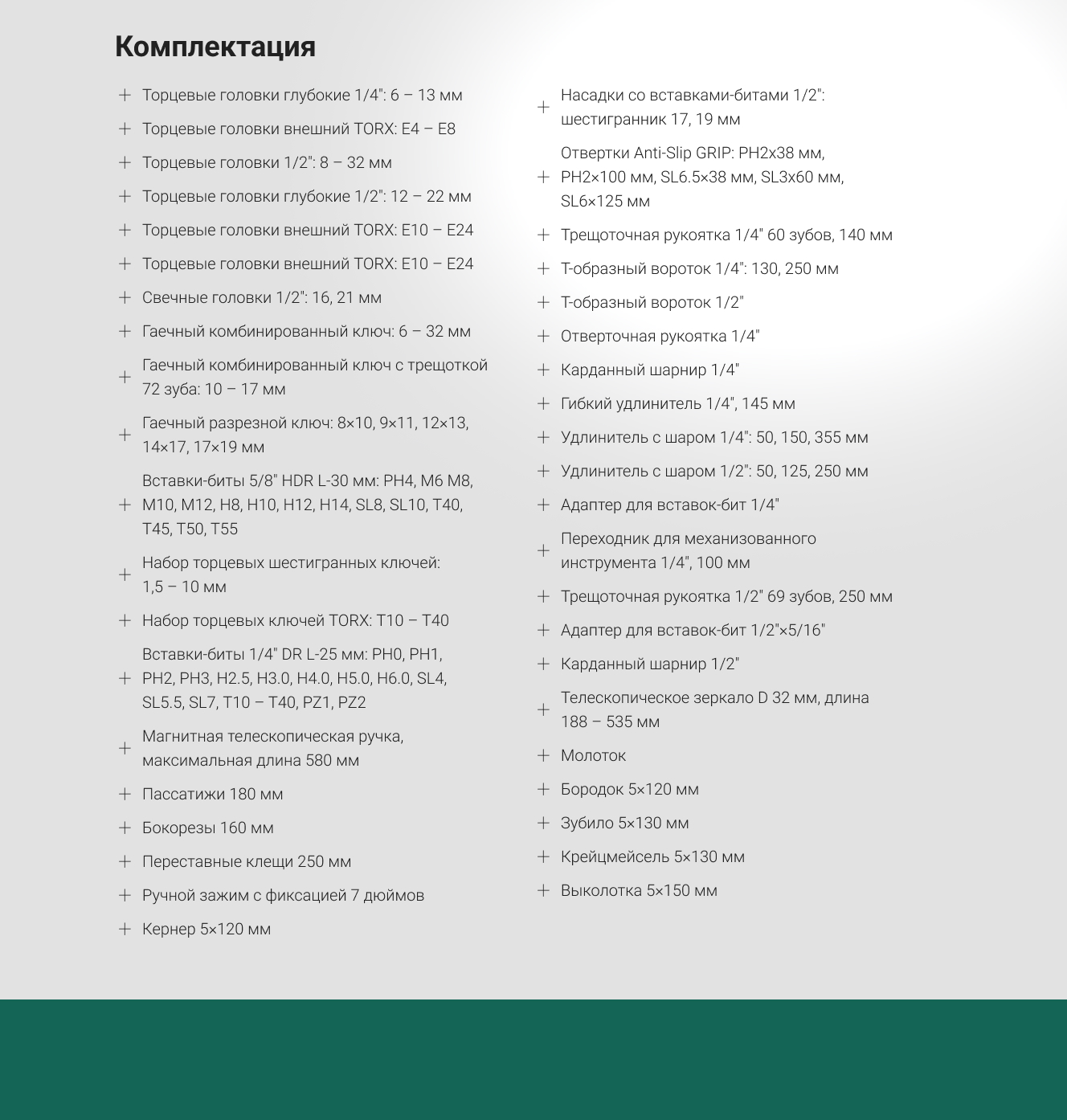 Состав набора , крепкий кейс, отличные трещотки, внешний вид инструмента.