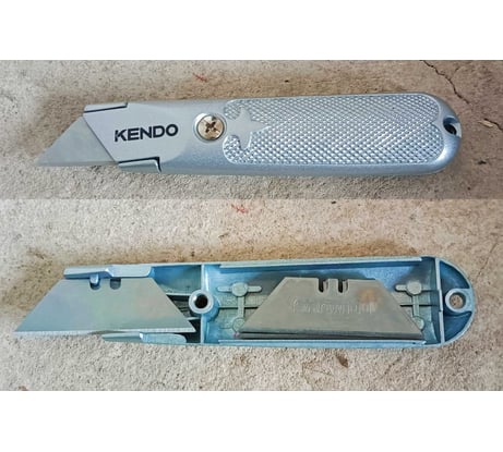 Нож полностью из металла, рифленая ручка, люфт минимальный. Есть отсек для запасных лезвий.