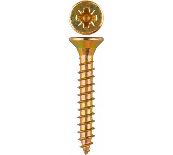 Универсальные саморезы с потайной головкой с шлицем Pozidriv (PZ) применяются для крепления различных элементов к деревянным и пластмассовым основаниям. При предварительном сверлении отверстий может применяться и при креплении к стальным основаниям. Универсальный желтый саморез изготовлен из углеродистой стали. Покрытие нанесено гальваническим методом цинкования с жёлтой пассивацией.