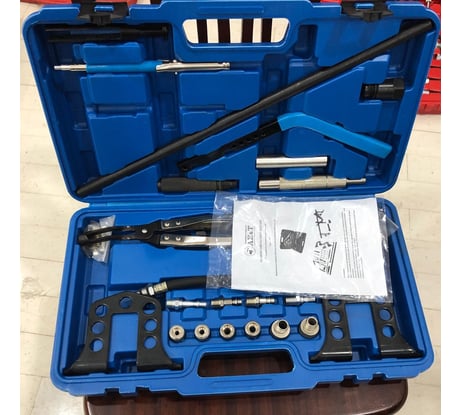дешево,надеюсь сердито. Комплектация Держатели опорной штанги , 2 шт.; Опорная штанга; Рычаг; Прижимная втулка клапанной пружины; Крепёжные винты и штифты, 14 шт.; Адаптеры резьбовые для подачи воздуха, 2 шт.; Шланг воздушный; Адаптеры быстросъёмные для подключения компрессора, 4 шт.; Щипцы для снятия маслосъёмных колпачков прямые; Щипцы для снятия маслосъёмных колпачков изогнутые; Оправки для установки маслосъёмных колпачков, 6 шт.; Инструмент для снятия и установки сухарей клапанов; Инструкция; Кейс.