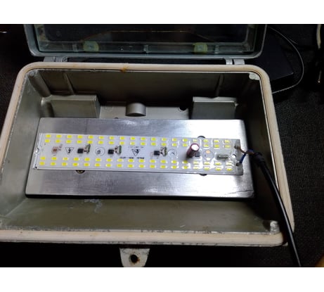 требует доработки. на фото третий прожектор в процессе перехода от 1000W галогена к светодиодам. установлена ёмкость для уменьшения мерцания и уменьшен ток, толстый алюминий для отвода тепла+ корпус. в принципе можно встроить в любой подходящий по размеру светильник. использование в стоковом варианте сомнительно.