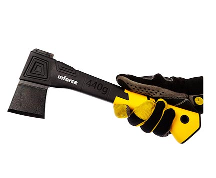 Универсальный топор 440 г Inforce 06-12-18 дополнен специальным чехлом с фиксатором, при помощи которого лезвие инструмента не повреждается при перевозке.