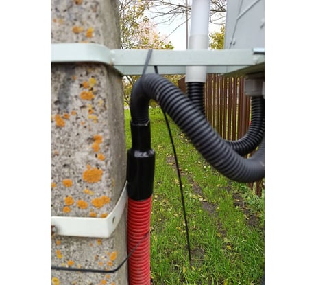 Для сохранения жесткости конструкции, на красную гофру надето уплотнительное кольцо, на него заглушка для двухстенных труб 50мм. В ней просверлено отверстие 32мм. В него уже вставлена чёрная труба/гофра и всё это запаено термоусадкой.