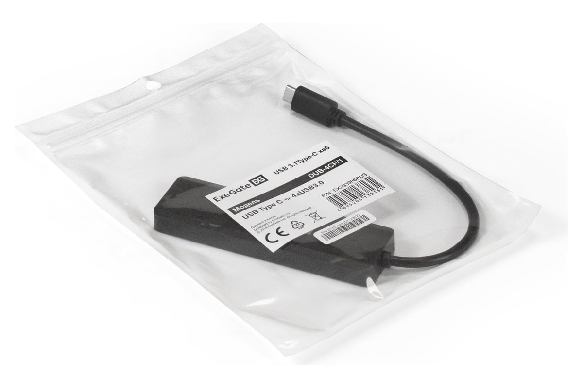 USB-Хаб концентратор ExeGate 4-в-1 DUB-4CP 1 кабель-адаптер USB Type C-4xUSB3.0, Plug&Play, черный 293986