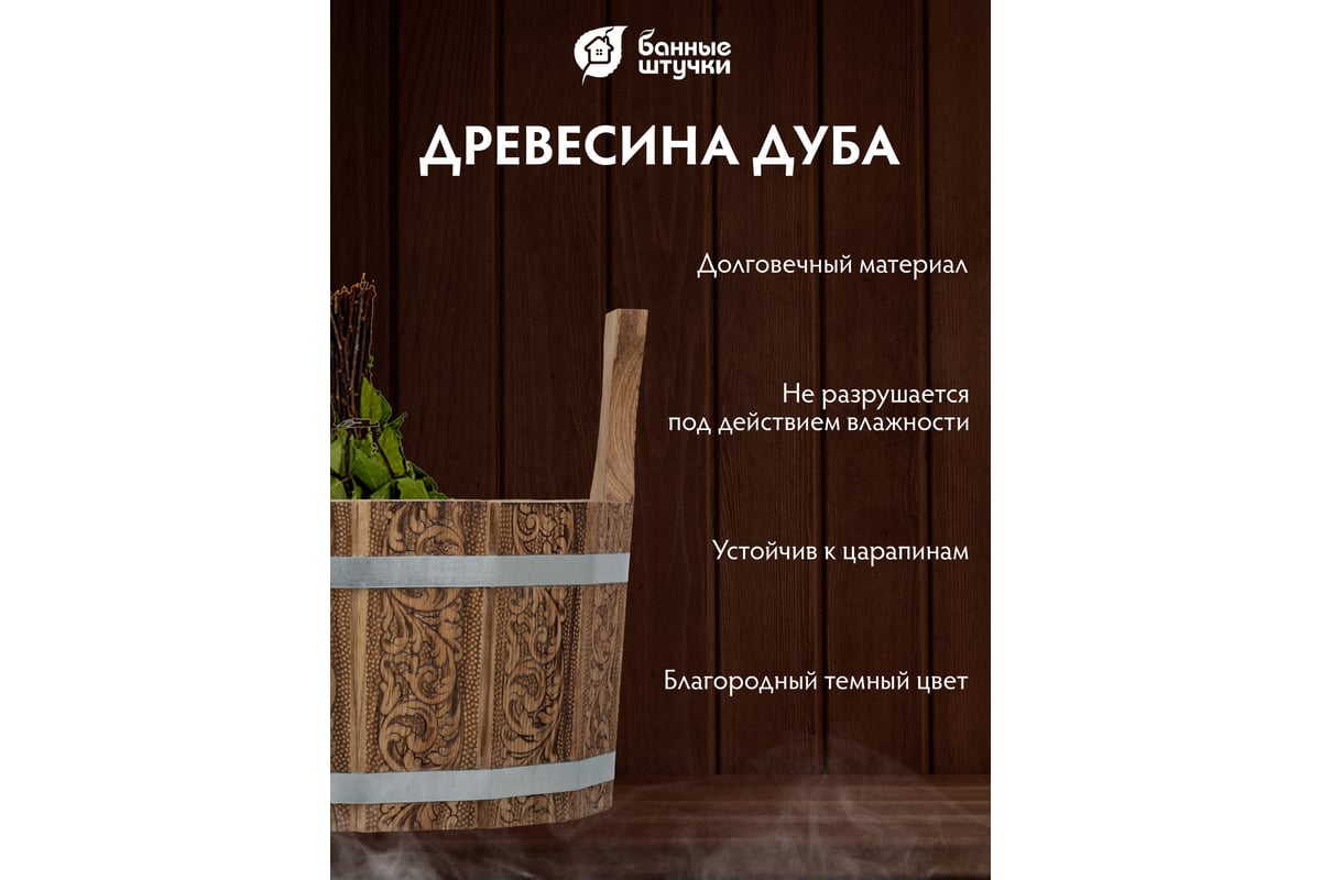 Бондарные изделия из дуба славятся высокой прочностью. Для древесины дуба характерна высокая устойчивость к влаге, что очень важно для изделий, которые используются в банных процедурах. Бондарные изделия с ажурными узорами – это идеальное качество, имитирующее ручную резьбу, а одинаковые симметричные рисунки создают эффект коллекционного раритета.