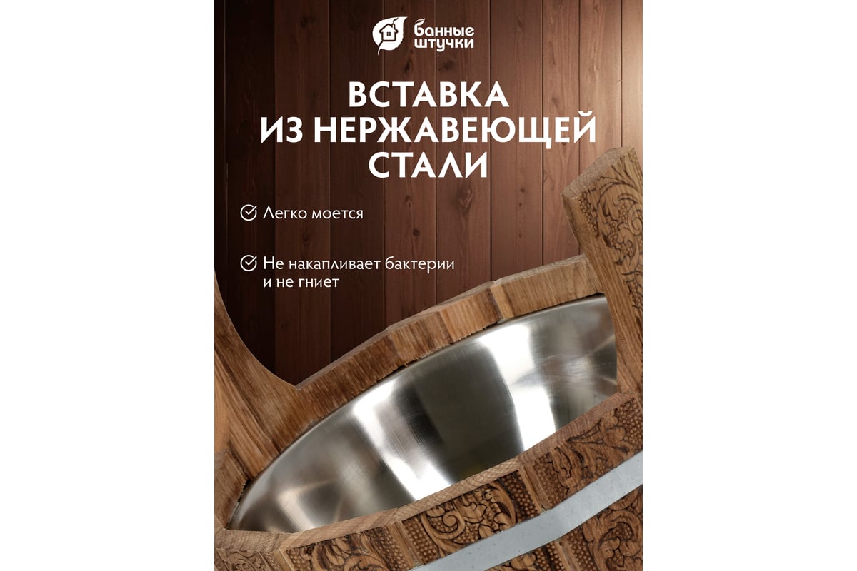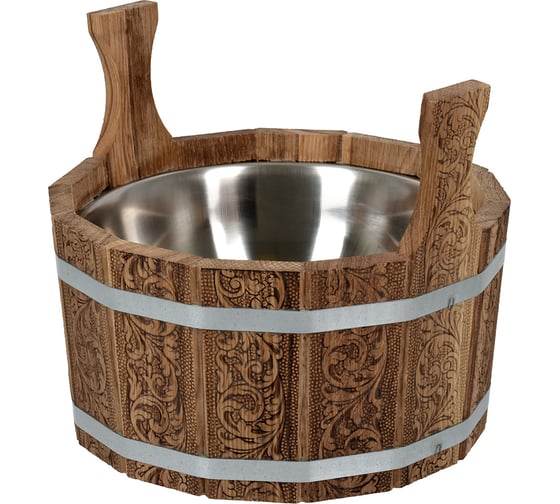 Ушат шайка Банные Штучки Цветочный орнамент c нержавеющей вставкой, 5 л, дуб 33371 используется в бане или в сауне.