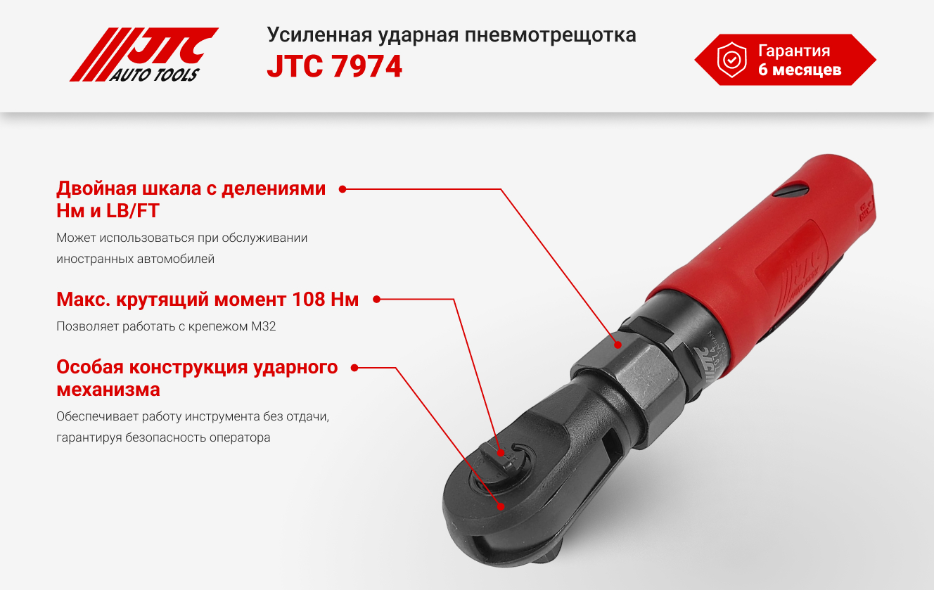 Усиленная ударная пневмотрещотка JTC 7974 имеет широкую клавишу пуск для удобного использования.