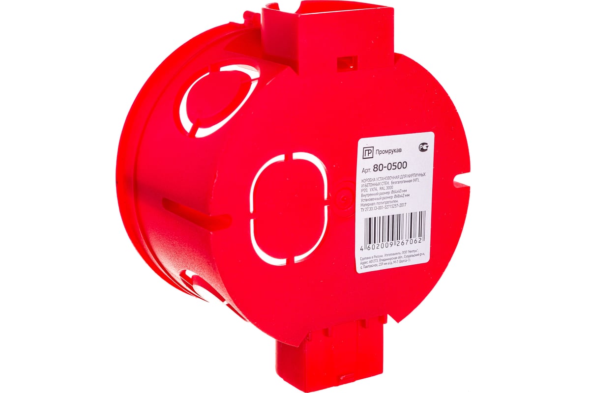 Установочная коробка Промрукав безгалогенная HF 68х42 80-0500 предназначена для установки в сплошные кирпичные, бетонные, гипсокартонные и другие полые стены.