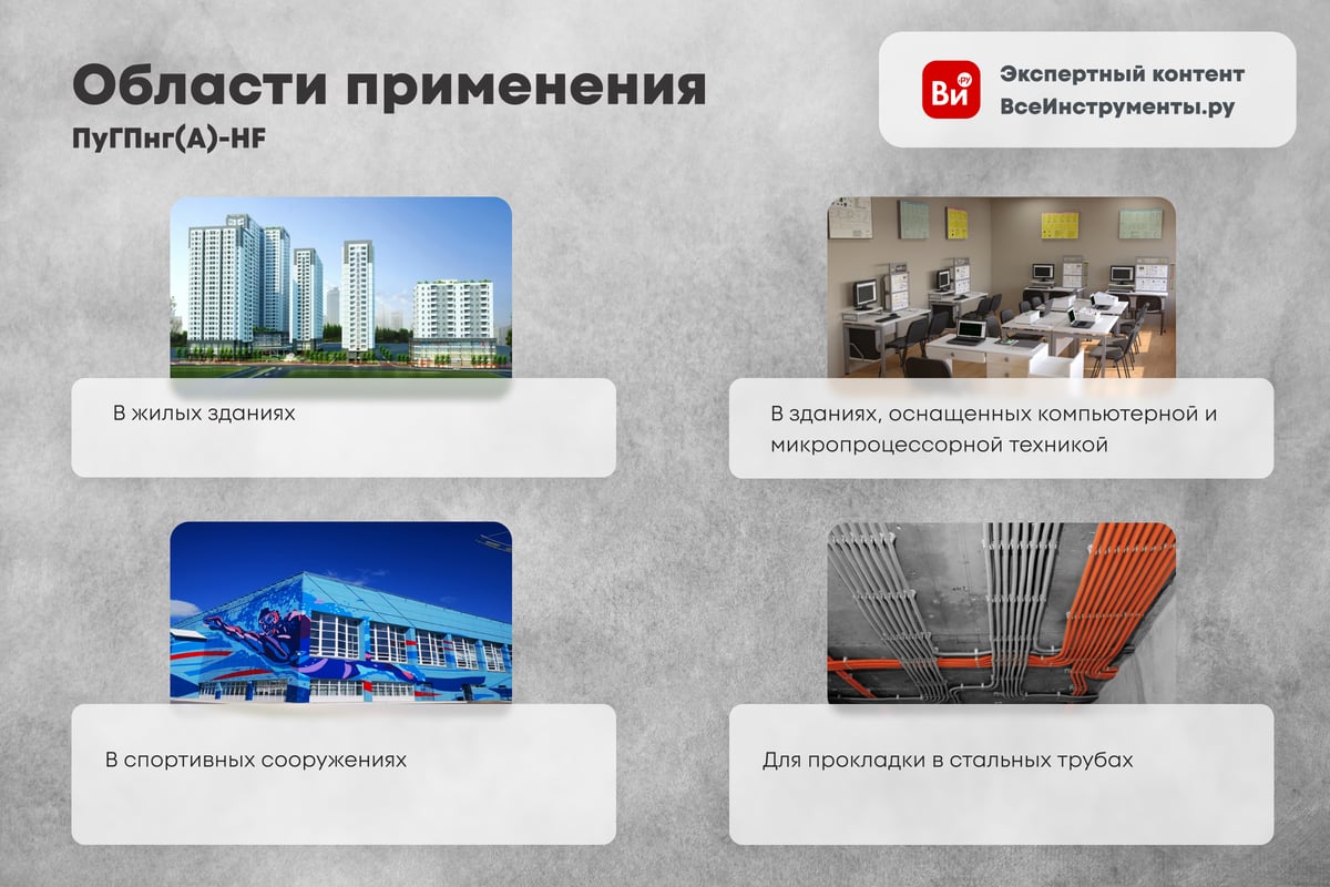 Установочный провод ПуГПнг(A)-HF предназначен для стационарной прокладки внутри жилых, офисных и производственных помещений. Его используют в основном для монтажа электрических щитков, автомобильной проводки, внутри люстр и светильников, а так же как перемычки. Благодаря своему исполнению в условиях пожара кабели не распространяют горение при групповой прокладке по категории А и не выделяют токсичных соединений с цветовым маркированием.