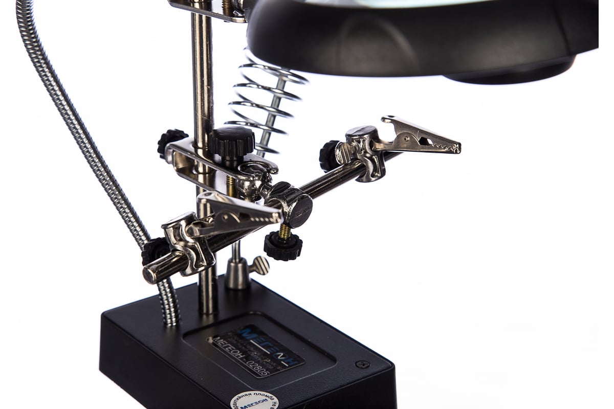 Устройство вспомогательное третья рука МЕГЕОН 02805 к0000006723 применяется при паяльно-сборочных работах. Предназначено для зажима мелких деталей в любом нужном положении. Оснастка состоит из основания, увеличительного стекла (90 мм), двух дополнительных линз, двух зажимов типа ''крокодил'', светодиодной подсветки, встроенного держателя паяльника.