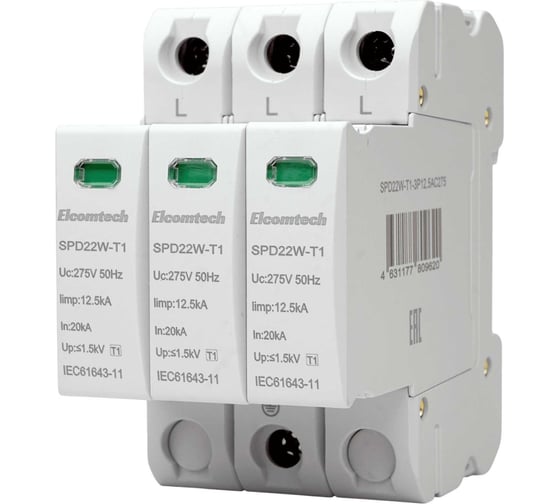Устройство защиты импульсных перенапряжений ELCOMTECH T1 3P 50kA 275V SPD22W-T1-3P12.5AC275 УТ-00039092