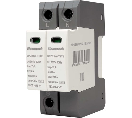 Устройство защиты импульсных перенапряжений ELCOMTECH T1T2 2P 50kA 385V SPD21W-T1T2-1N7AC385 УТ-00039134