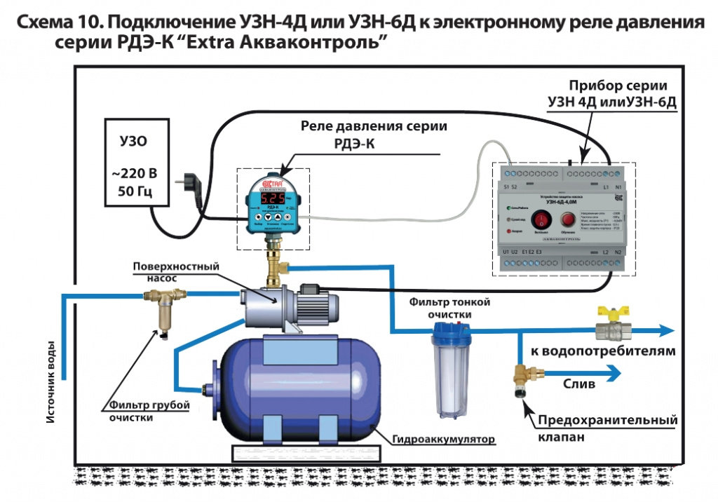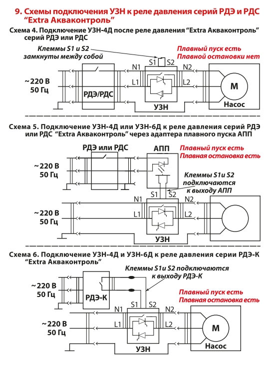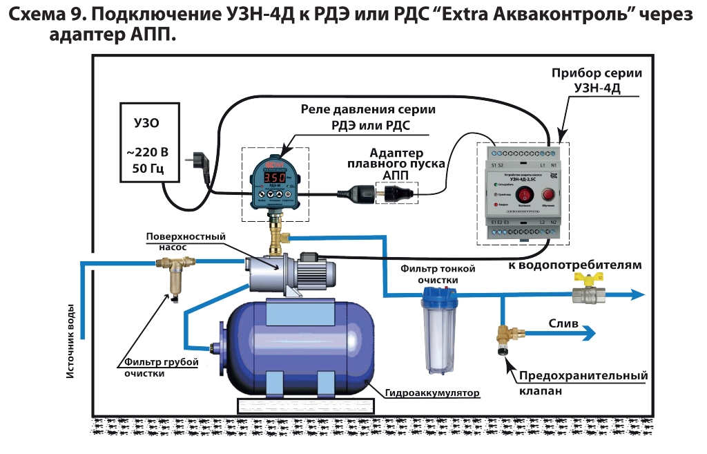 Устройство защиты насоса серий УЗН-4Д - П предназначено для защиты поверхностных насосов центробежного типа с асинхронными электродвигателями, которые не имеют встроенных электронных систем управления, частотного преобразователя или плавного пуска. УЗН обладает функцией обучения характеристикам подключенного насоса, что позволяет использовать его с насосами разных мощностей без проведения электроизмерительных работ и кропотливой настройки. Устройство комплектуется входи внешнего управления типа “Сухой контакт” и выходами для аварийного реле с перекидными контактами.