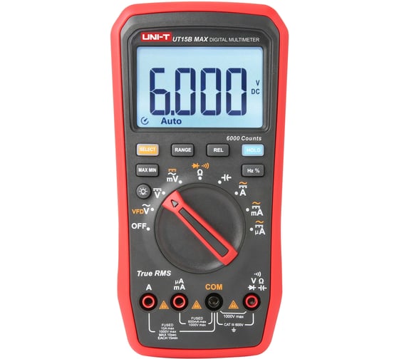 UNI-T UT15B MAX Мультиметр-автомат цифровой 00-00016202 с измерением истинного среднеквадратичного значения (True RMS) отличается компактным и портативным дизайном, быстрым откликом, высокой устойчивостью к электромагнитным помехам и поставляется с позолоченными тонкими измерительными щупами. Они также имеют защиту от входного напряжения до 1000 В, что делает их идеальным инструментом для инженеров-электронщиков и электротехников.