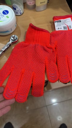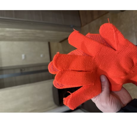 Толстые и тёплые перчатки с удобной посадкой. Яркий цвет помогает находить перчатки в залежах инструментов, а защита от скольжения в виде синих точек - надёжно удерживать инструмент для безопасности использования. Манжеты плотно прилегают к рукам, но при этом не натирают запястья. Отсутствуют торчащие нитки и качество изготовления в целом высокое: материал медленно изнашивается