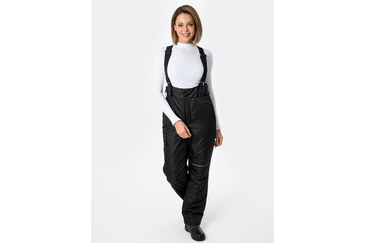 Брюки на съемных бретелях, с застежкой на молнию и две пуговицы на утепленном расширенном поясе, с шлевками под ремень. Бретели состоят из резинки и держателя бретелей, регулируются при помощи передвижения рамки.