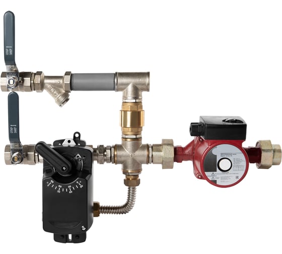 Смесительный узел для подключения воздушных завес с водяным теплообменником к системе отопления. Благодаря встроенному электромагнитному клапану узел в автоматическом режиме контролирует проток теплоносителя через теплообменник завесы тем самым регулирует ее тепловую мощность и температуру помещения.