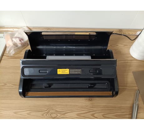 Вакууматор полностью справляется со своими функциями. Понятная инструкция. Есть отсек для хранения рулона и ножичек для отрезания пакета. С твёрдыми продуктами воздух откачивает полностью. Влажные продукты надо вакуумировать аккуратно, чтобы жидкость не высасалась в вакууматор. Чтобы защелкнуть крышку ваккуматора, надо посильнее нажимать на края крышки.