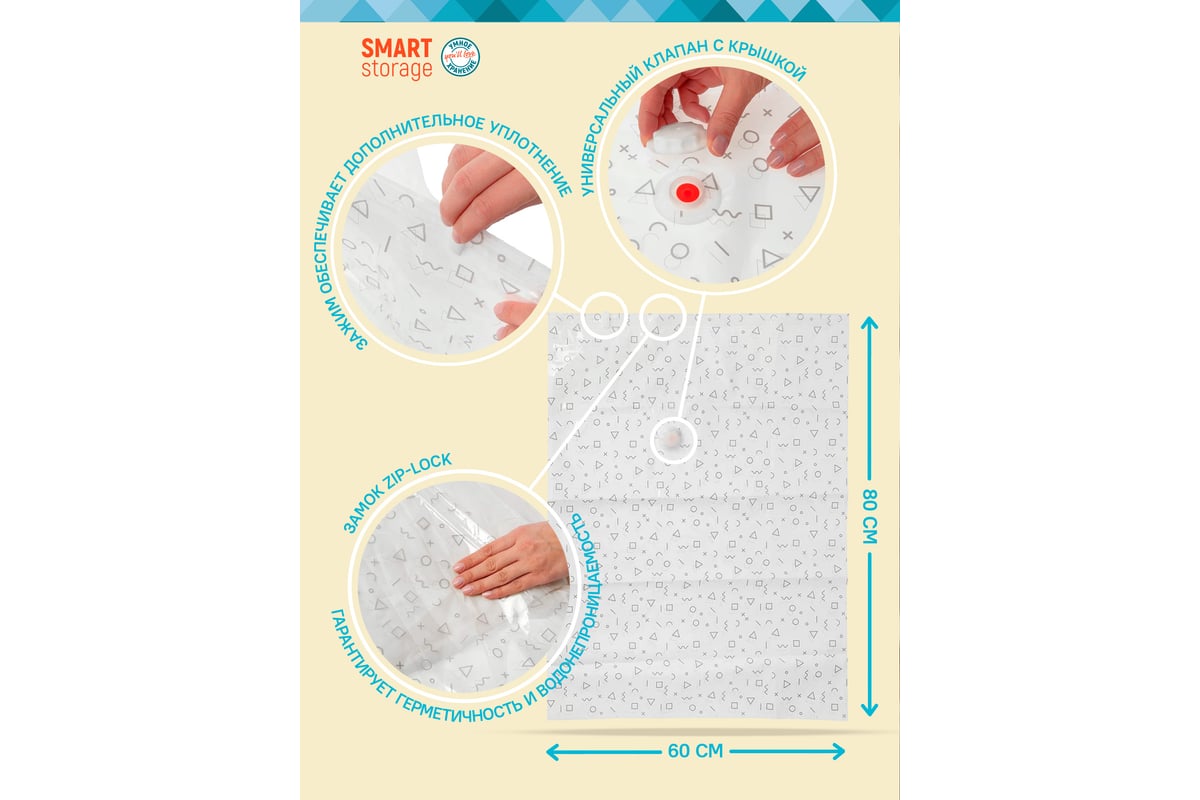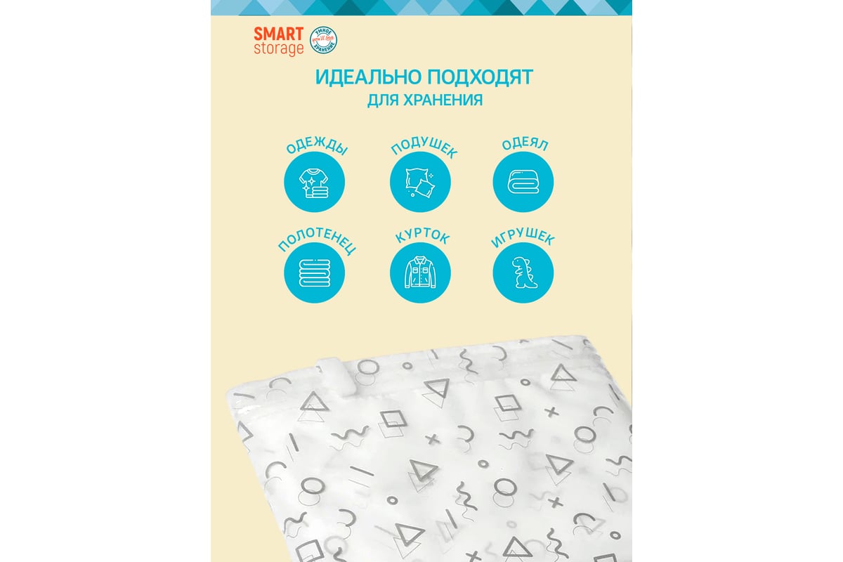 Экономия до 75% объема. Пакет также защищает вещи от влаги и плесени, выцветания, пыли, запаха и насекомых.