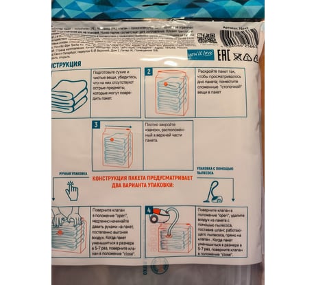 Экономия до 75% объёма. Пакет также защищает вещи от влаги и плесени, выцветания, пыли, запаха и насекомых.