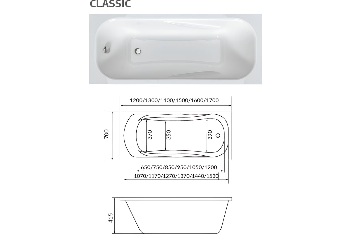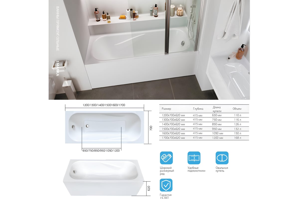 Ванна акриловая 1Marka CLASSIC 170x70 см, в наборе 3 в 1: прямоугольная ванна, металлические ножки, слив-перелив хром 01кл1770Акс1