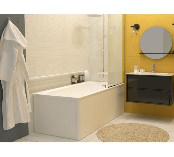 Ванна из стального листа с гладкой стекловидной поверхностью, прямоугольной формы, пристенная, ориентация универсальная. В комплекте с ванной поставляется каркасная подставка из стали.