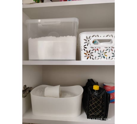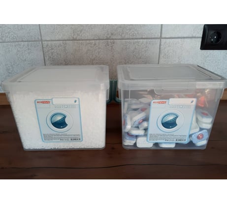 Красивый и прочный контейнер с ручкой и крышкой с замком. Куплен для хранения соли и таблеток для ПММ.