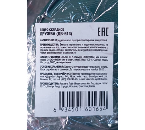 Прочное, герметичное, водонепроницаемое складное ведро торговой марки «Дружба» (ДВ-613)