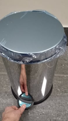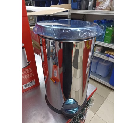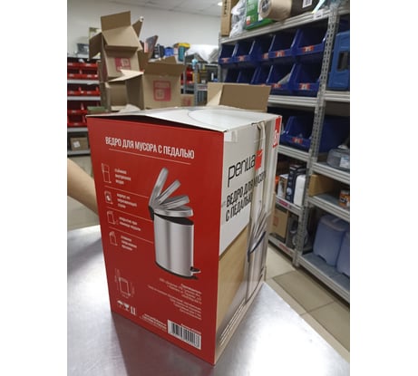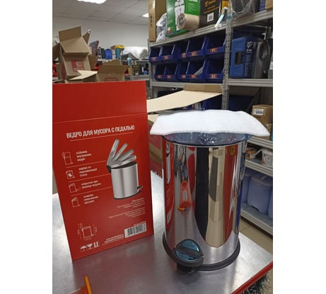 Ведро пришло в целостности, сверху и снизу присутствует подкладка, крышка в прозрачной пленке. Внутреннее ведро легко вынимается, с удобной ручкой. Педаль требует нажатия с заметным усилием.