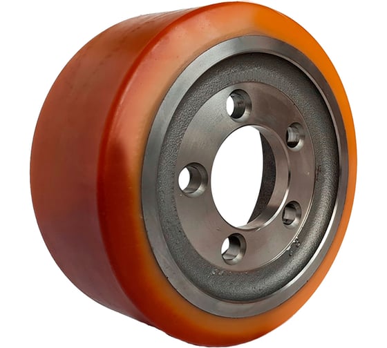 Материал контактного слоя из полиуретана гарантирует превосходное сцепление и износостойкость, улучшая безопасность и эффективность в работе. Чугунный обод придает колесу дополнительную прочность и долговечность, что особенно важно в условиях интенсивного использования.