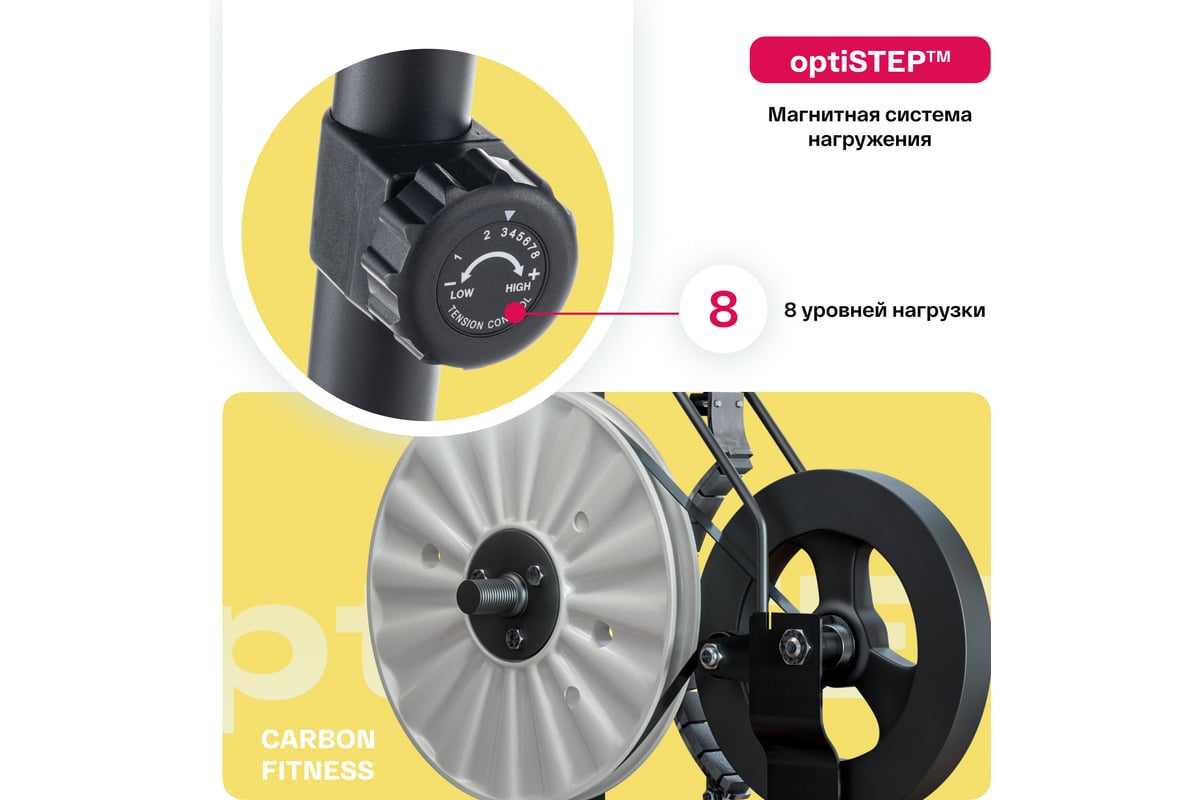 Такая конструкция снижает нагрузку на поясницу и обеспечивает поддержку для спины, позволяя тренироваться без риска повреждений. Велотренажер оснащен магнитной системой нагружения optiSTEP™ с 8 уровнями нагрузки и маховиком BioFusion с инерционным весом 16 кг которые обеспечивают плавность и стабильность движений.