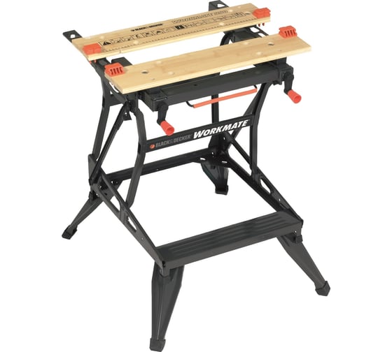 Верстак Black&Decker WM550 успешно применяется в качестве опоры для обработки заготовок, стойки для инструмента, а также подставки для пиления дров. Прочная стальная станина выдерживает нагрузку до 250 кг. Есть возможность выбора высоты модели - 775 мм или 595 мм. Приспособление легко складывается, что упрощает его транспортировку. В сложенном виде габариты верстака составляют 610х830х218 мм. В качестве материала тисков используется ДСП.