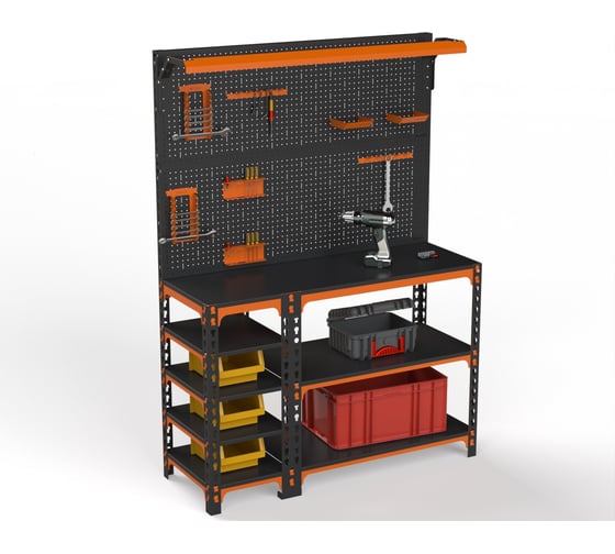 Верстак ООО Металекс серия SUN 950x1500x400 мм, с бок. полками, 2-мя панелями и комп. освещения, оранжево-чёрный 111417