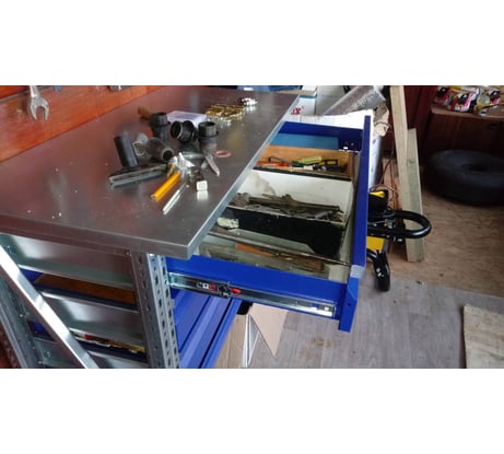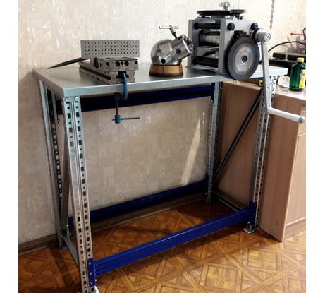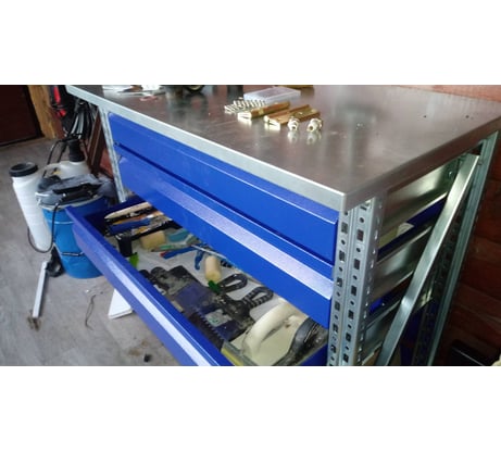Взял перед новым годом со скидкой за 4929р. спасибо большое ВИ. Стол очень понравился. Брал в маленькую мастерскую и установил ручные вальцы, тиски и прочие тяжелые железки.Крепеж на месте, инструкция по сборки понятна но она и не нужна, в инструкции и всякие допы описаны. Не понравились короткие свесы по бокам, что то прикрутить на струбцие не получится. Столешница крепкая покрыта стальным, оцинкованным листом 1.2 мм. Пластиковые подпятники из комплекта могут послужить но сразу заменил на опциональные по 260 рублей за пару( на фото есть) их можно и к полу прикрутить. Подпятники брал в другом магазине, в ВИ нет их почему то. На сэкономленые деньги заказал еще одну продольную балку синяя такая, здесь 380р и полку 990р.