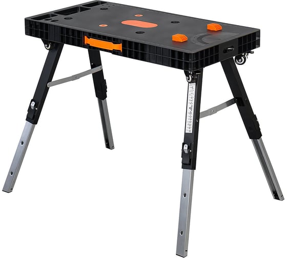 В комплект входит два упора и две втулки для крепления прижимных струбцин, а так же съемный лоток для мелких деталей. Конструкция верстака-трансформера со стальной рамой, оцинкованными ножками, имеющими 3 ступени регулировки по высоте, и растяжками-фиксаторами ножек обеспечивает необходимую жесткость конструкции и грузоподъемность до 150 кг.