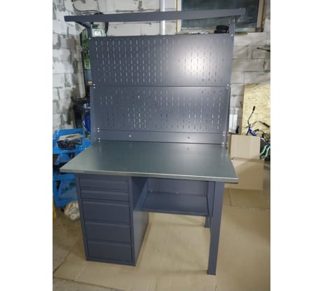Верстак-стол - устойчивый, удобный, для слесарных, столярных работ, для производств и мастерских. Поставляется в разобранном виде. Крепкая и надежная конструкция столешницы из дерева и металла выдерживает нагрузку до 300 кг. Специальное полимерное покрытие на ножках и полке защищает от коррозии и придает столу эстетичный вид. Надежная и прочная конструкция стола , позволяет выполнять даже силовые операции с инструментом и металлоизделиями. Столешница представляет собою плиту из фанеры толщиной 24 мм, закрытую коробом из оцинкованного листа толщиной 1,2 мм. Конструкции столешницы и короба разработаны таким образом, чтобы после сборки верстака на его рабочей поверхности отсутствовали неиспользуемые отверстия для крепежных элементов, головки болтов, заклепок и т. д. Поверхность столешниц идеально ровная. Это обеспечивает дополнительный комфорт пользователю. Опора для верстаков и столов из холоднокатаной стали 1,5 мм, согнутой в П-образный профиль. Цвет серый RAL 7024. Перфорированная панель служит для размещения инструментов, крепежа и расходных материалов. Отверстия имеют диаметр 5 мм с шагом перфорации 50 мм. Перфорированная панель комплектуется дополнительной панелью для установки розеток, тумблеров и выводов компрессора, а так же козырьком для установки лампы освещения.