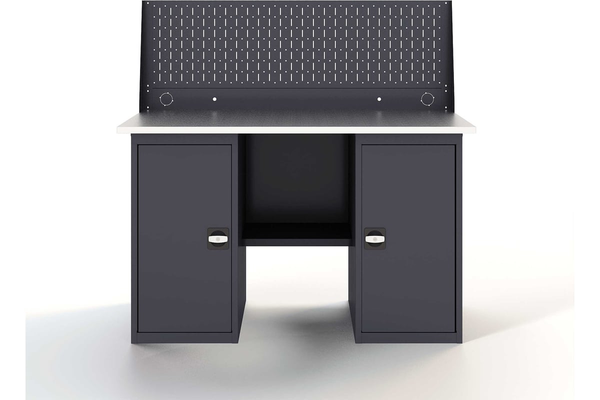 Верстак-стол - устойчивый, удобный, для слесарных, столярных работ, для производств и мастерских. Поставляется в разобранном виде. Крепкая и надежная конструкция столешницы из дерева и металла выдерживает нагрузку до 300 кг. Специальное полимерное покрытие на ножках и полке защищает от коррозии и придает столу эстетичный вид. Надежная и прочная конструкция стола , позволяет выполнять даже силовые операции с инструментом и металлоизделиями. Столешница представляет собою плиту из фанеры толщиной 24 мм, закрытую коробом из оцинкованного листа толщиной 1,2 мм. Конструкции столешницы и короба разработаны таким образом, чтобы после сборки верстака на его рабочей поверхности отсутствовали неиспользуемые отверстия для крепежных элементов, головки болтов, заклепок и т. д. Поверхность столешниц идеально ровная. Это обеспечивает дополнительный комфорт пользователю. Опора для верстаков и столов из холоднокатаной стали 1,5 мм, согнутой в П-образный профиль. Цвет серый RAL 7024. Перфорированная панель служит для размещения инструментов, крепежа и расходных материалов. Отверстия имеют диаметр 5 мм с шагом перфорации 50 мм. Перфорированная панель комплектуется дополнительной панелью для установки розеток, тумблеров и выводов компрессора.