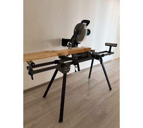 Компактность, легкость относительная 12кг, но по сравнению с остальными на рынке, этот сильно легче. Очень добротная конструкция, везде толстый металл, боковые расширители стола на двух направляющих. Клал две доски 40ки, расширители их даже не заметили. Складывается/раскладывается за 20 секунд, удобно переносить. Подвижный стол на быстрозажимах, посадка адаптируется под любую торцуху или станок. Расширители тоже на удобных быстрозажимах, ролик регулируется по высоте. Верстак устойчивый, если отпустить торцуху, то нет даже намека на опрокидывание.