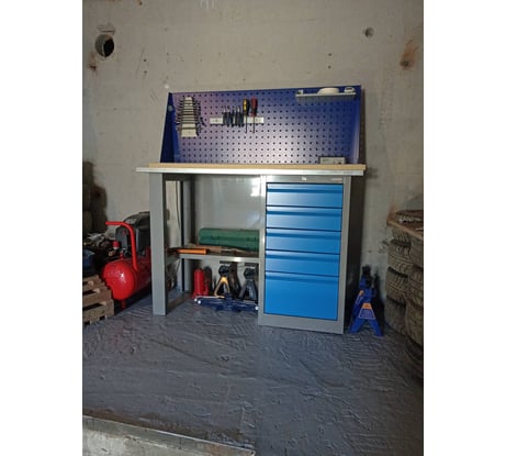 Стол предназначен для установки в небольших мастерских, автосервисах или гаражах. Верстак оснащён пятью ящиками, которые служат для удобного хранения инструмента и комплектующих.