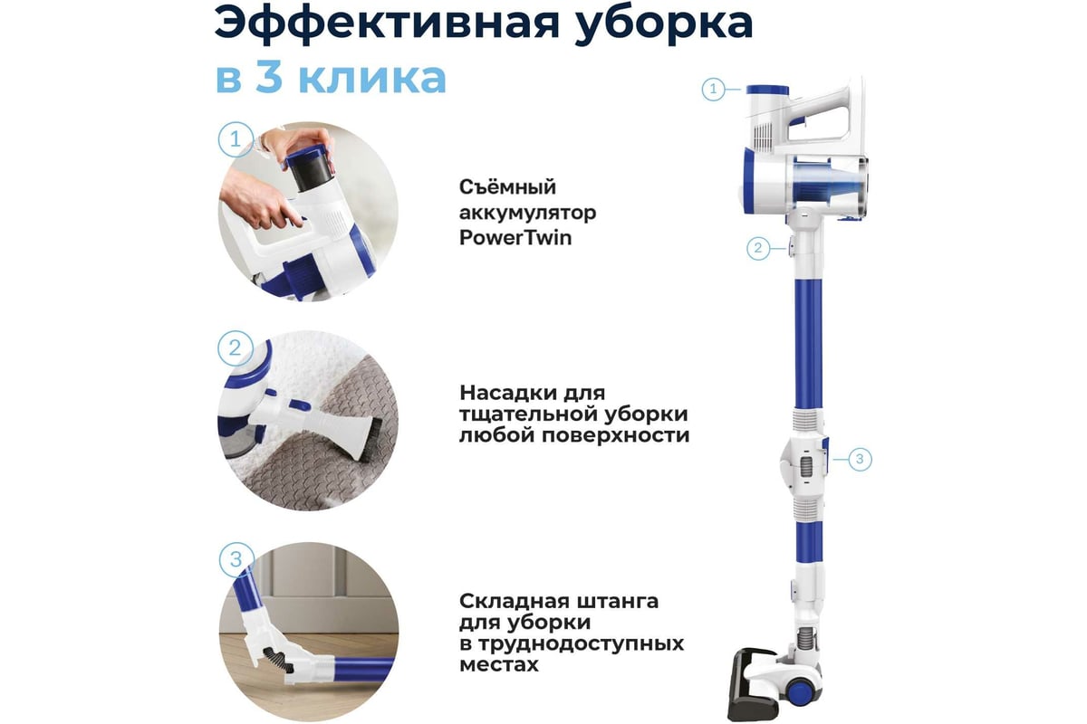 Вертикальный беспроводной пылесос Remezair RMVC-501 MultiClick S ЦБ-00000274 - оптимальное соотношение параметров и стоимости. Мощная моторизированная щетка 7800 об/мин с LED подсветкой. Производит глубокую очистку любых поверхностей. Удобная складная штанга ClickStick раскладывается в один клик, позволяя вам производить эффективную уборку в труднодоступных местах и под мебелью.