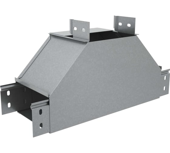 Для обеспечения заданных радиусов изгиба кабельной трассы при монтаже используется Т-отвод вертикальный вверх серии "PLUS". Конструкция элемента применима для отвода трассы вверх, при этом разворачивая открытую часть металлического лотка вокруг своей оси на 90 градусов.