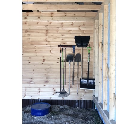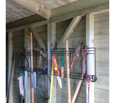 Вещь в принципе неплохая, но для поделки из проволоки слишком дорогая. Черенком вниз инструмент вешать нерационально, он занимает слишком много места, а за отверстие в черенке, так это проще 15 саморезов в стену закрутить и вешать на них. Использовать сие изделие можно с доработкой. Чтобы повесить инструмент за стандартную 8 мм дырку в черенке, нужно крючки обрезать наполовину и разогнуть с 90 градусов до градусов 30. Вот тогда на вешалку с песней залетают 15 лопат, граблей, вил, плоскорезов и т.д. которые подвешиваются за стандартное отверстие в черенке. Если отверстие в черенке отсутствует, просверлить его минутное дело. Если бы производитель сделал крючки подлиннее, чтобы на один крючок навешивалось по 2 лопаты, было бы просто прекрасно.