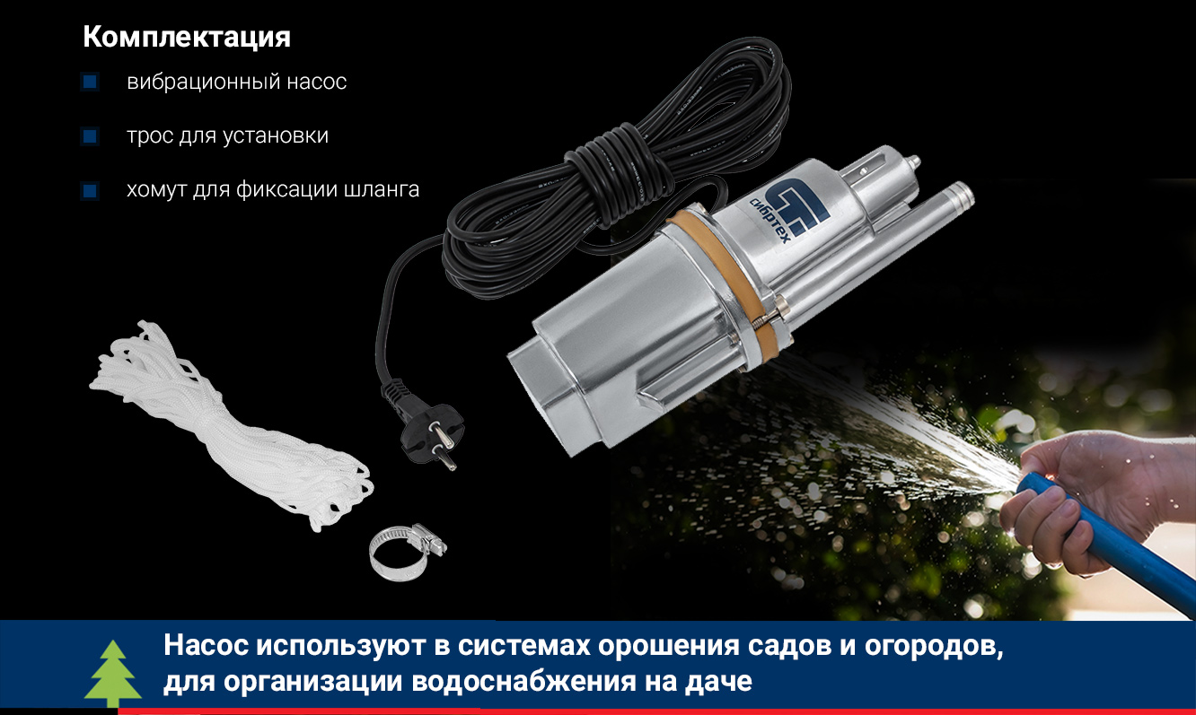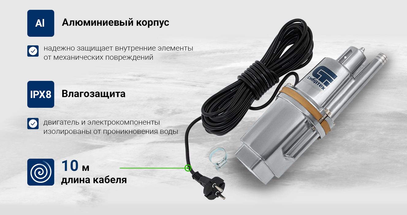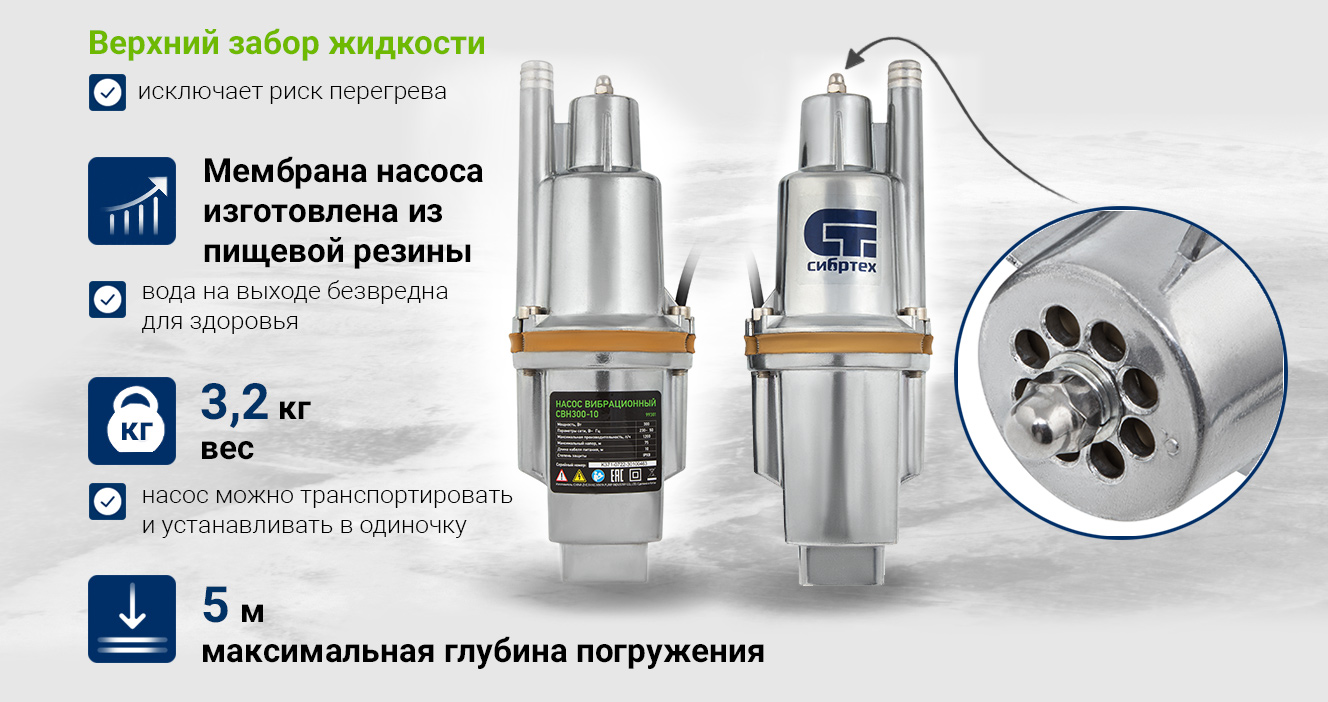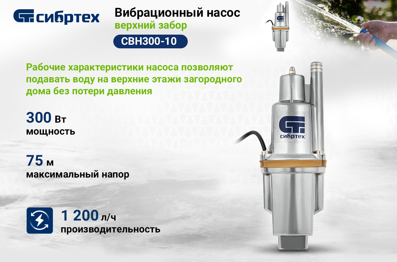 Вибрационный насос СИБРТЕХ СВН300-10 кабель 10 м 99301 предназначен для подачи воды из колодца. Подходит для перекачивания чистой и пресной воды.