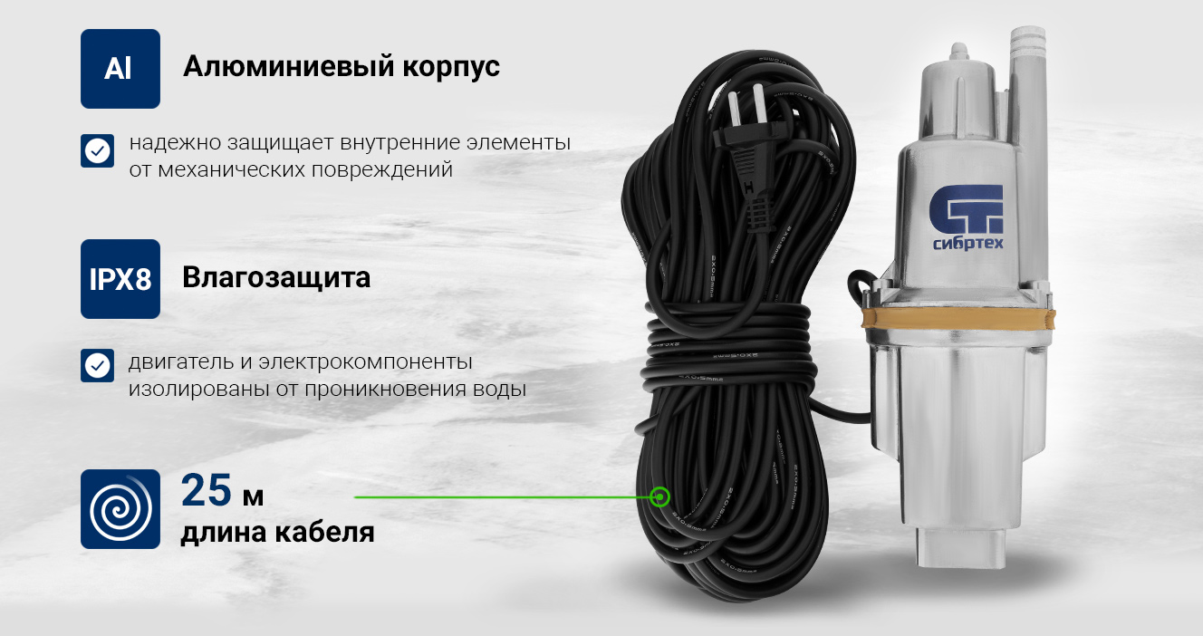 Вибрационный насос СИБРТЕХ СВН300-25 кабель 25 м 99303 предназначен для подачи воды из колодцев и скважин.