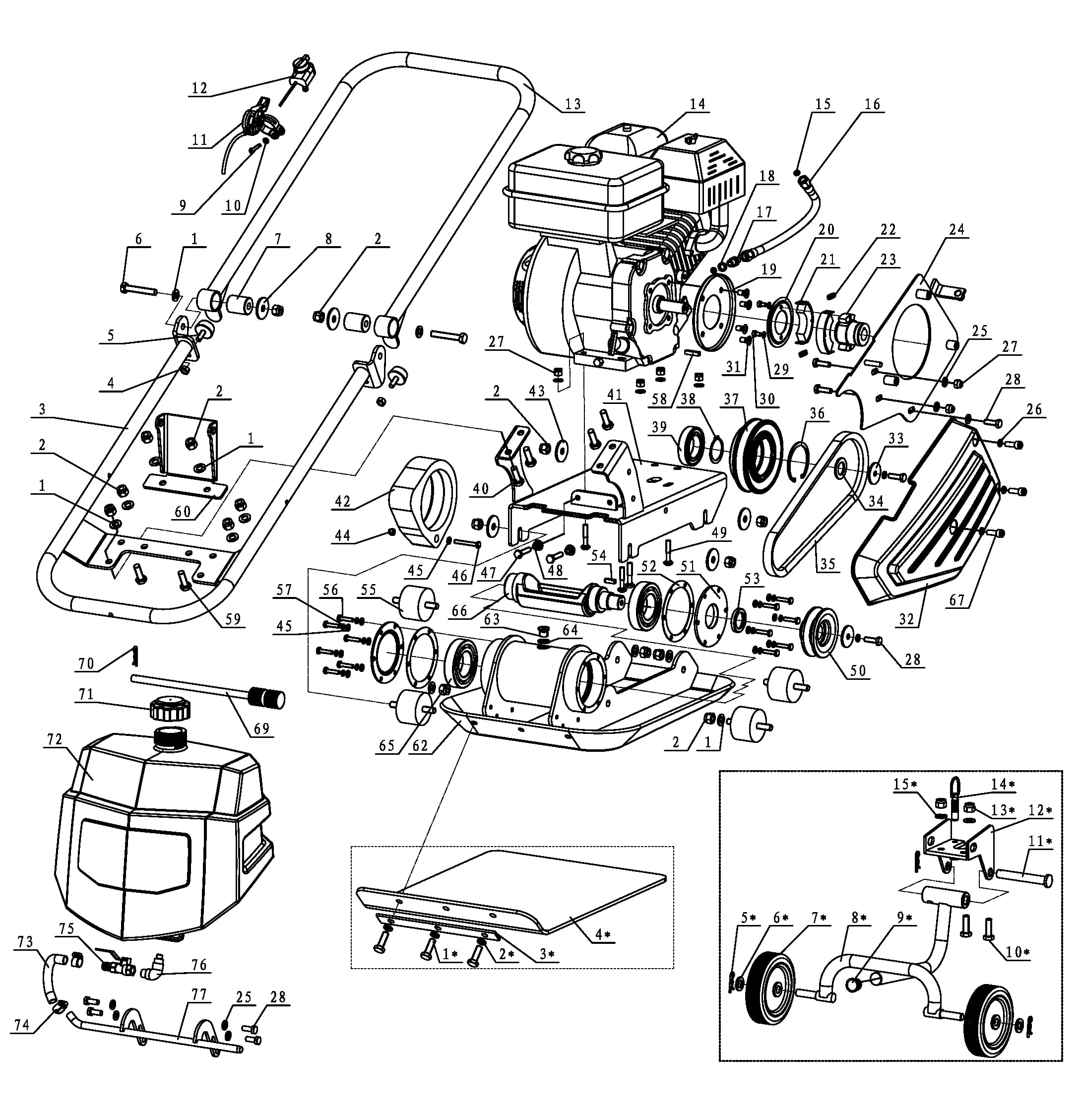 - Рама виброплиты с двигателем и трансмиссией и с системой для разбрызгивания воды