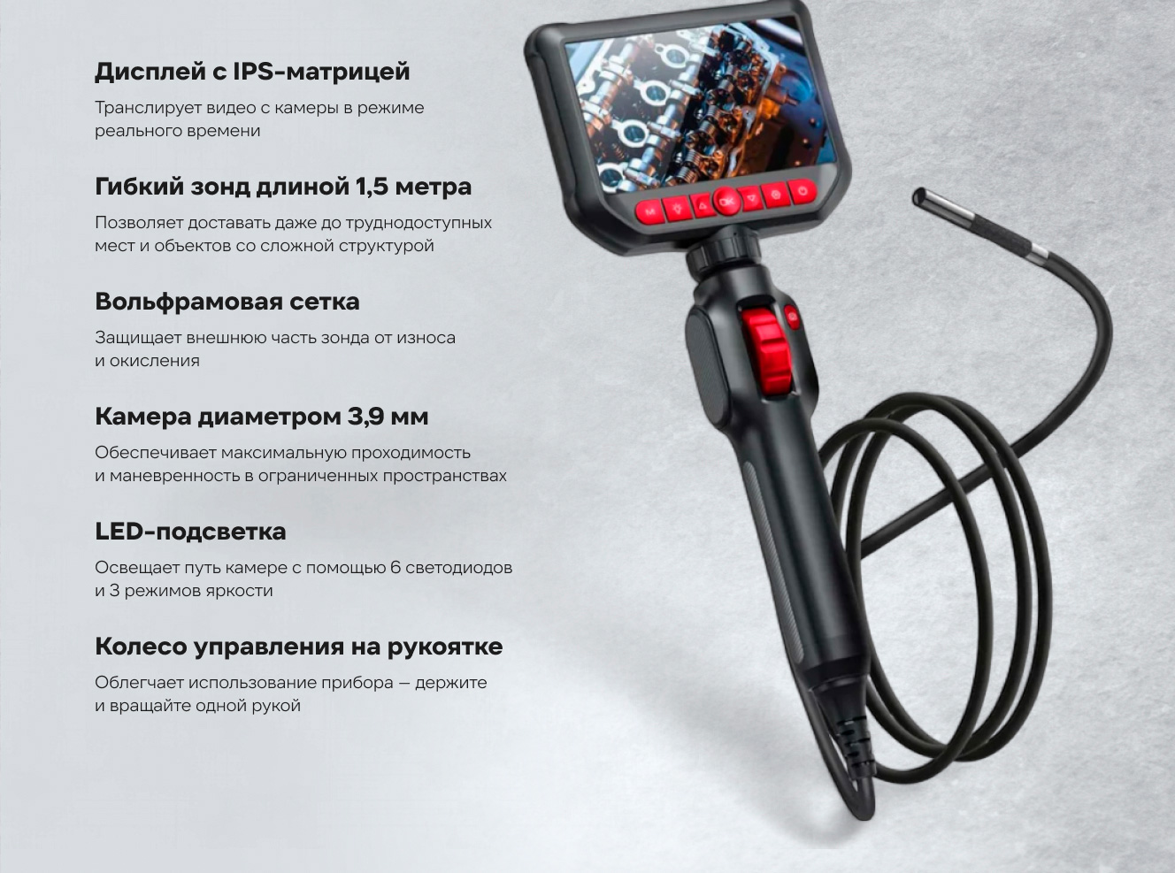 Зонд эндоскопа имеет универсальную длину 1,5 м и диаметр камеры всего 3,9 мм, оптимальный для автодиагностики. Зонд гибкий, удобен в использовании, если объект отличается нестандартной (сложной) геометрией. Внешняя оболочка дистальной части усилена вольфрамом для увеличения срока эксплуатации.